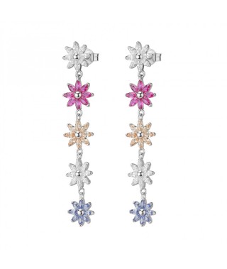 Orecchini pendenti in argento 925 e zirconi colorati a forma di fiori.