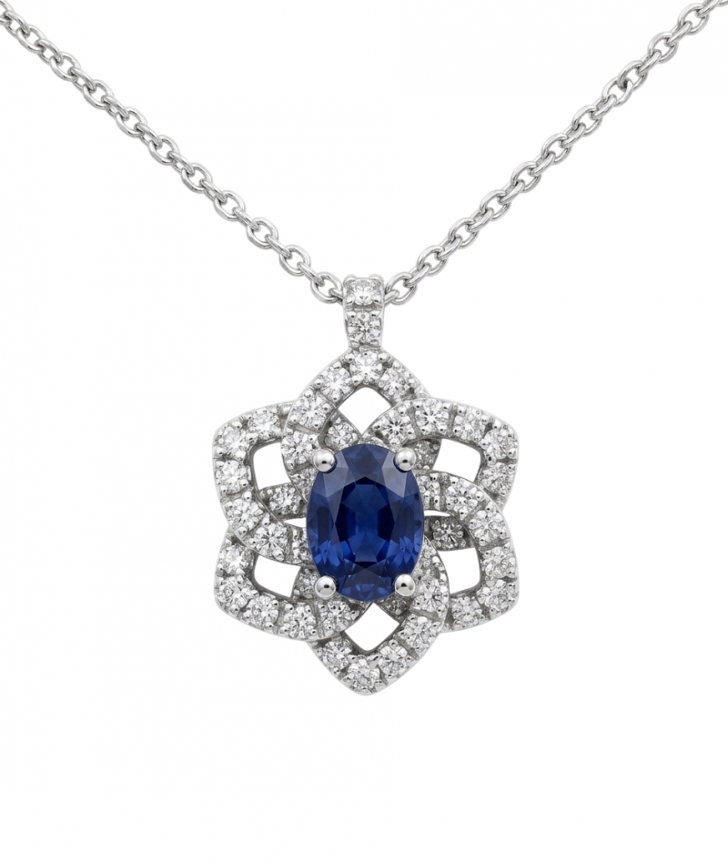 Collana e pendente in oro bianco 18kt con zaffiro kanchanaburi a taglio ovale ct. 0,43 e diamanti autentici a taglio brillante ct. 0,21 G VS.