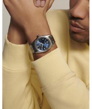 Orologio con cassa in acciaio, quadrante blu e datario a ore tre.