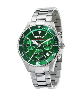 Cassa e bracciale in acciaio, quadrante verde, datario e cronografo, vetro minerale.