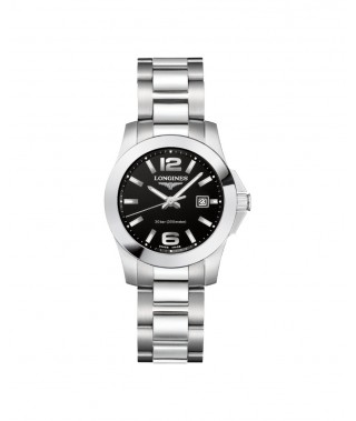 Orologio con cassa e cinturino in acciaio, quadrante nero e datario.