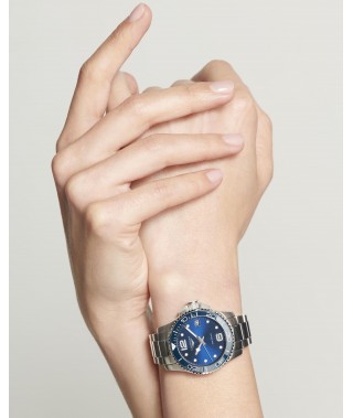 Orologio con cassa e cinturino in acciaio, ghiera in ceramica blu, quadrante blu.