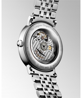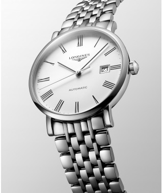 Orologio con cassa e cinturino in acciaio con quadrante bianco con numeri romani dipinti.