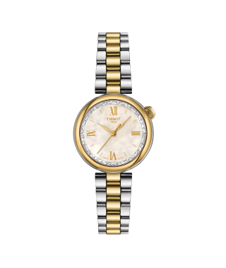 Cassa e cinturino in acciaio e rivestimento in pdv oro giallo, quadrante in madreperla bianca, vetro zaffiro.