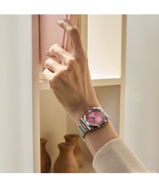 Orologio con cassa e cinturino in acciaio, quadrante rosa a raggi di sole e datario.