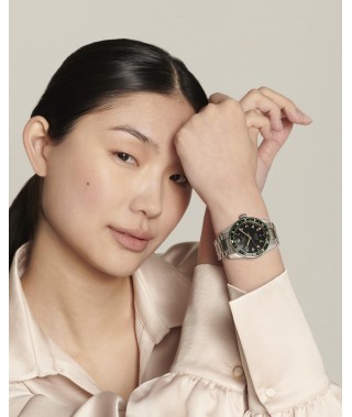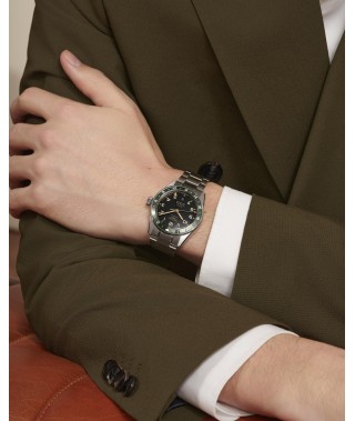 Orologio con cassa e cinturino in acciaio, lunetta in ceramica e quadrante antracite con ghiera verde.