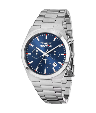 Cassa e cinturino in acciaio, quadrante nero, vetro minerale, datario e cronografo.