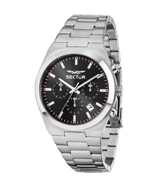 Cassa e cinturino in acciaio, quadrante nero, vetro minerale, datario  e cronografo.