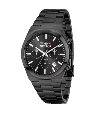Cassa e cinturino in acciaio nero, quadrante nero, vetro minerale, datario e cronografo.