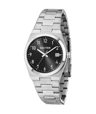 Cassa e cinturino in acciaio, quadrante nero, vetro minerale, datario.