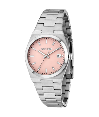 Cassa e cinturino in acciaio, quadrante rosa, vetro minerale, datario.