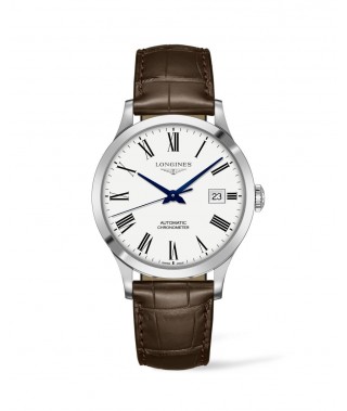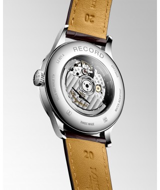 Orologio da uomo del marchio Longines della collezione Record Collection. Orologio con cassa in acciaio, quadrante bianco con datario, numeri romani e cinturino in pelle di alligatore marrone con chiusura deployant. Movimento automatico, vetro zaffiro, resistente all'acqua 30 metri.